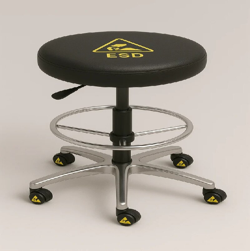 The ESD Stool with Moving Wheels is an electrostatic discharge–safe chair designed for industrial and electronics work environments. It features an ergonomic contoured seat and backrest, a yellow ESD warning symbol, adjustable height via side lever, and a polished stainless steel five-star base with smooth-rolling dual caster wheels. Ideal for electronics assembly, cleanrooms, and other ESD-sensitive workspaces, it combines comfort, safety, and mobility.